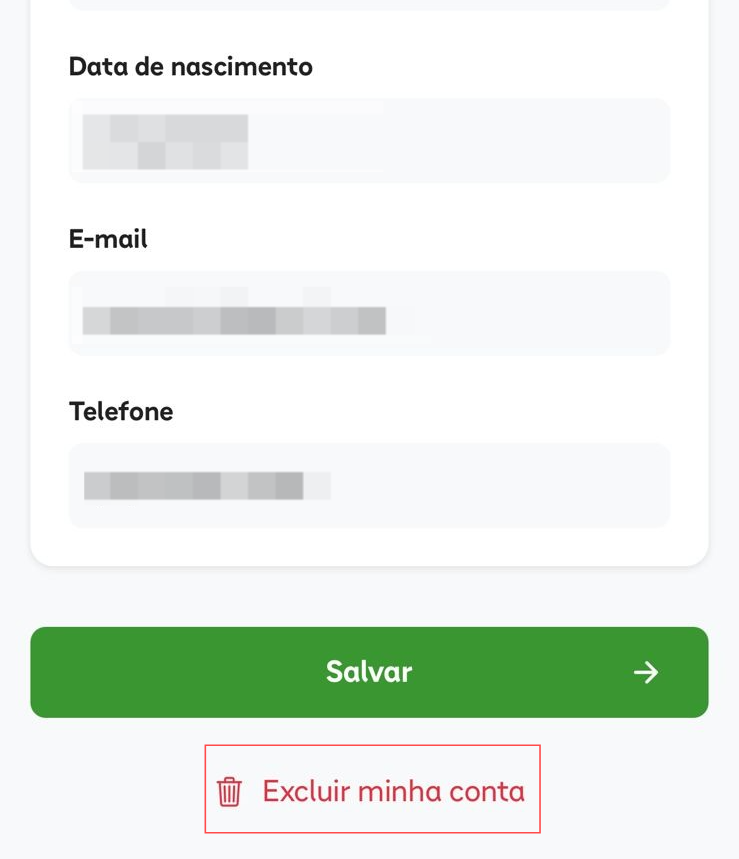 Após isso, será mostrado para você quais dados serão excluídos e quais serão anonimizados. Por fim, ao clicar em ‘Excluir’ novamente, você concluirá o processo de exclusão da conta.