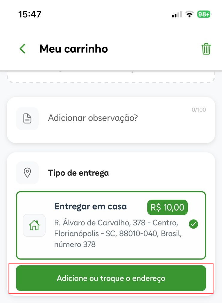 Toque no botão “Adicione ou troque o endereço”Assim você acessa sua lista de endereços.
